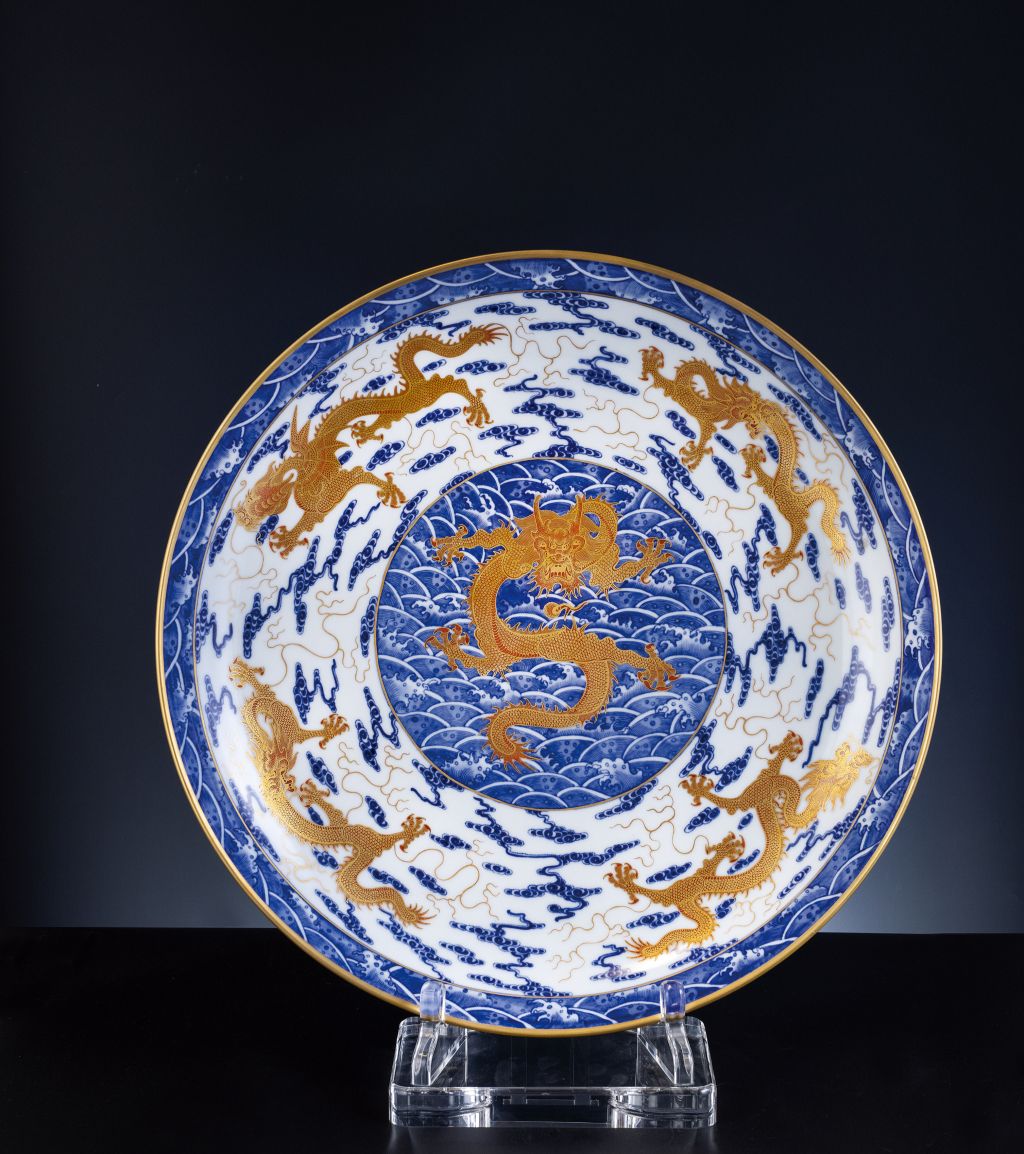 展厅中心,两件瓷器重器静置于特制展柜内,左边,一件清康熙款青花万寿大尊巍然屹立,尊高逾七十厘米,通体以青花篆书布满一万个形态万千的“寿”字,布局谨慎如漫山遍野,青花发色沉稳,釉面温润如玉;与之相照应的,是一件清乾隆款青花红彩描金云龙纹大盘,盘心一条五爪金龙腾跃于云海之间,青花勾勒的祥云与矾红绘就的龙身构成激烈比照,再以纯金描绘龙鳞细节,金光熠熠,这两件珍品领衔的清代瓷器展,将观众带入清代我国陶瓷技艺的黄金时代。